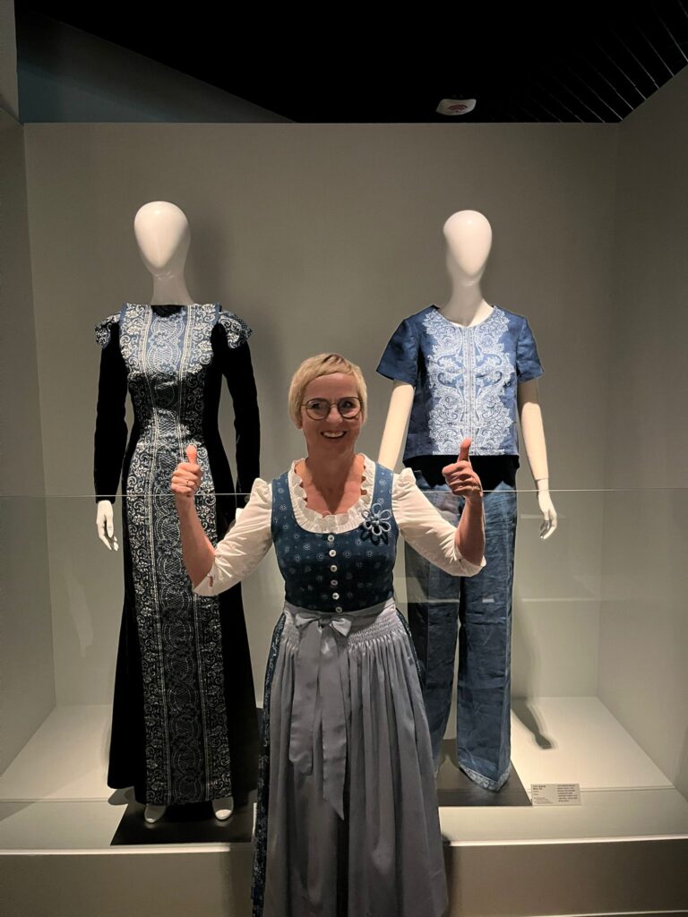 Auf dem Foto links seht ihr Maria Wagner vor den Kleidungsstücken aus Österreich, die ausgestellt werden – Links ein Kleid von Gottfried, Rechts mein Top Indigo Heritage zu einer Hose aus dem OÖ Heimatwerk.