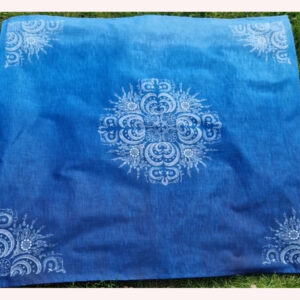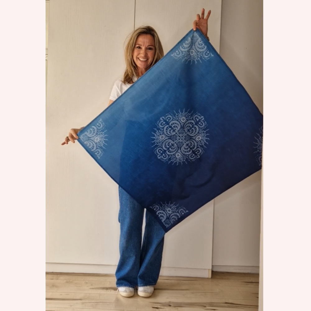 Dieses Tuch mit Original Mühlviertler Blaudruck ist im Farbverlauf von hellblau bis dunkelblau gefärbt und trägt ein wunderschönes Muster mittig sowie an den 4 Ecken.