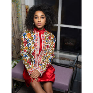 Diese Jacke ist ein Unikat und besticht durch den üppigen bunten Druck und den Bordürendruck an den Kanten. Sie ist aus einem traditionellen Stoff gefertigt, der in einer Handdruckerei in Bayern hergestellt wurde. Leider hat die Druckerei mittlerweile den Betrieb eingestellt, daher handelt es sich bei dieser Jacke um ein Einzelstück. Das traditionelle Muster „Tölzer Rose“ wird hier sehr modern in Szene gesetzt.