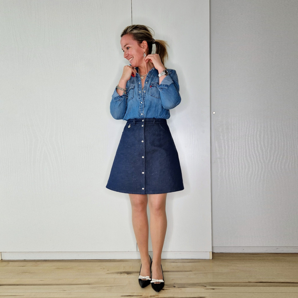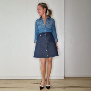 Nicht zu kurz, in schöner A-Linie und mit Druckknöpfen vorne ist er inspiriert von den 60ies und Mary Quant, der Erfinderin des Minirocks. Dass man ihn vielfältig stylen kann, versteht sich von selbst: von der Bluse bis zum T-Shirt, vom High Heel bis zum Sneaker macht der Jeansrock Mary alles mit!