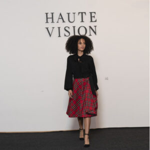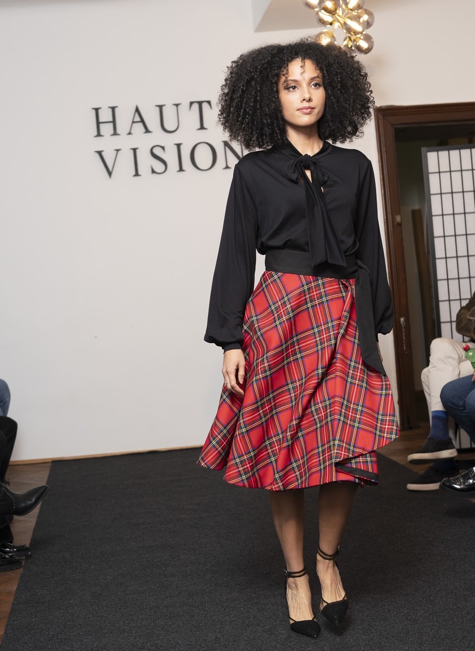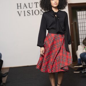 Der Schottenrock – ein Klassiker, völlig neu interpretiert! Dieser Wickelrock besticht durch den Schnitt, wodurch das Schottenkaro-Muster interessant angeordnet ist. Die Wasserfall Drapierung vorne wird noch durch ein schwarzes Band betont, welches innen von Hand am gesamten Rocksaum angenäht ist – so ist außen keine Saumnaht zu sehen und bei der Drapierung blitzt das Band hervor. Der Wollstoff ist glatt und fällt wunderbar weich schwingend.